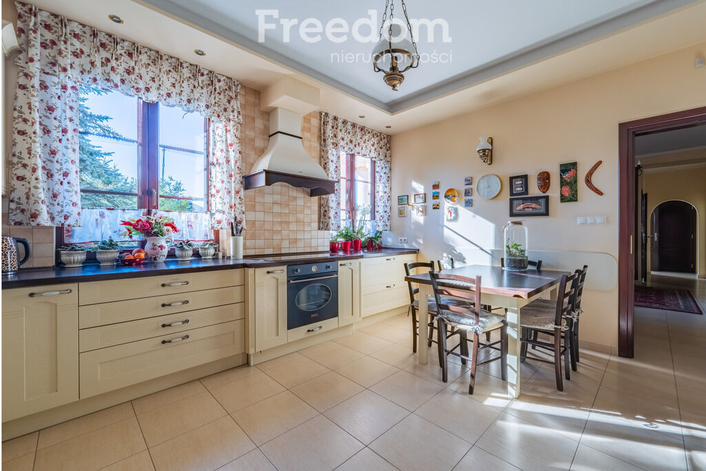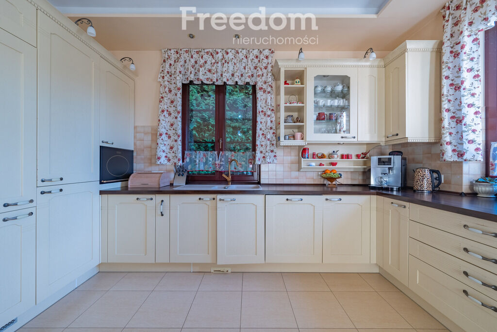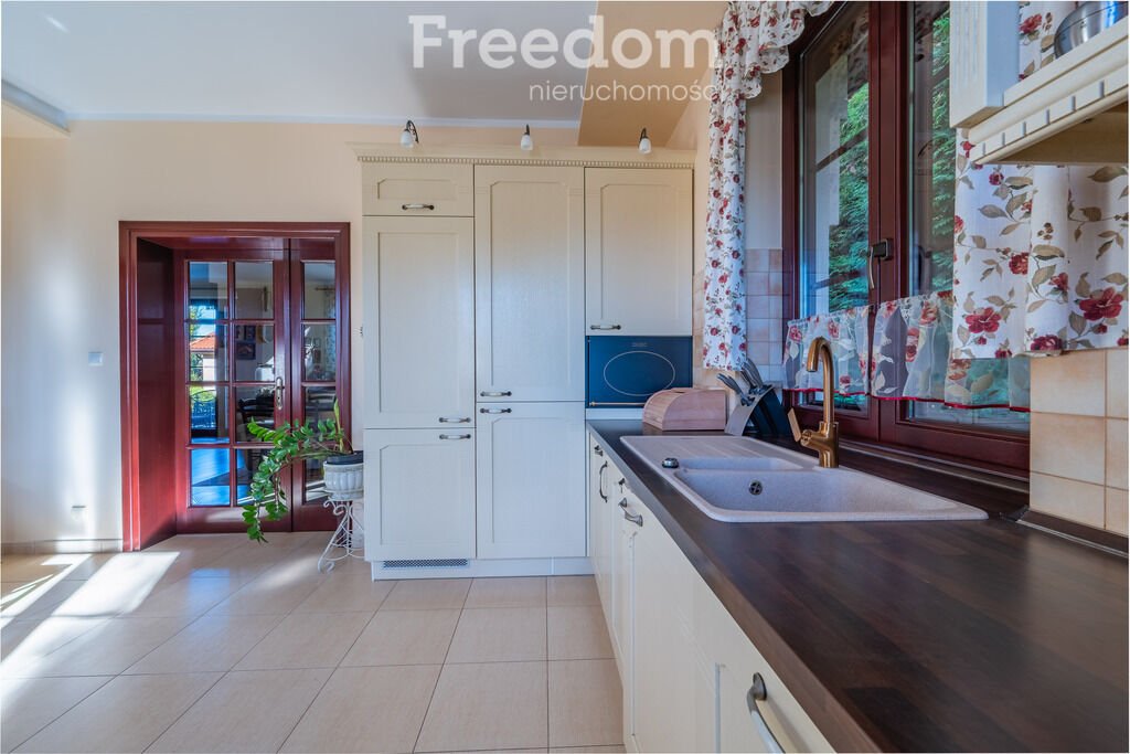 znajduje się kuchnia oddzielona od salonu przeszklonymi drzwiami. W